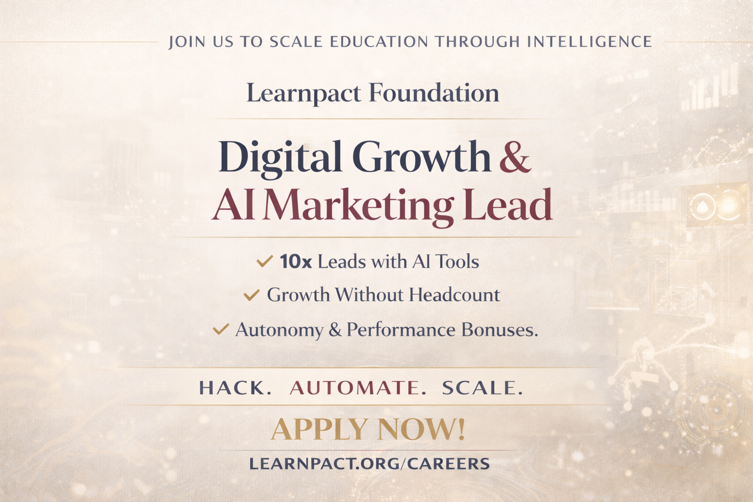 You will have complete autonomy, AI tools, and the mandate to 10x our lead generation in 6 months.